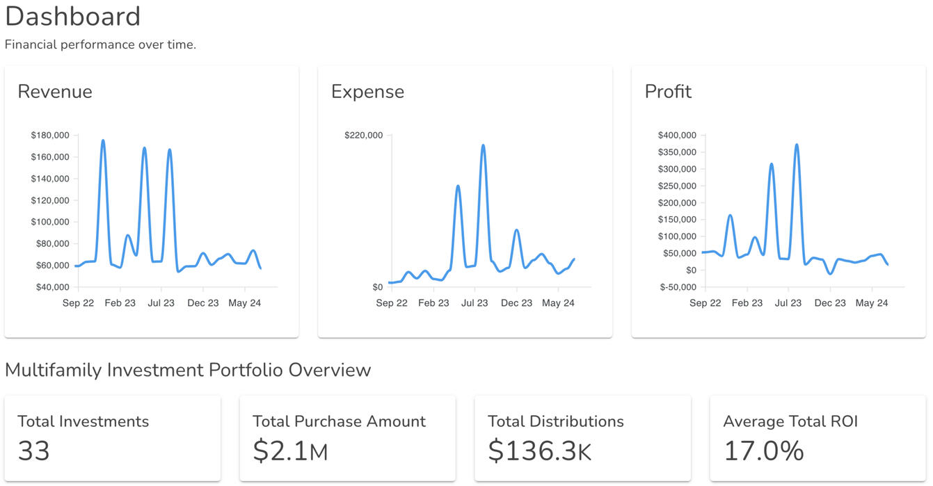 Passive Multifamily Investment Report: Get a comprehensive overview of your passive multifamily property performance including Total ROI and Annualized ROI.